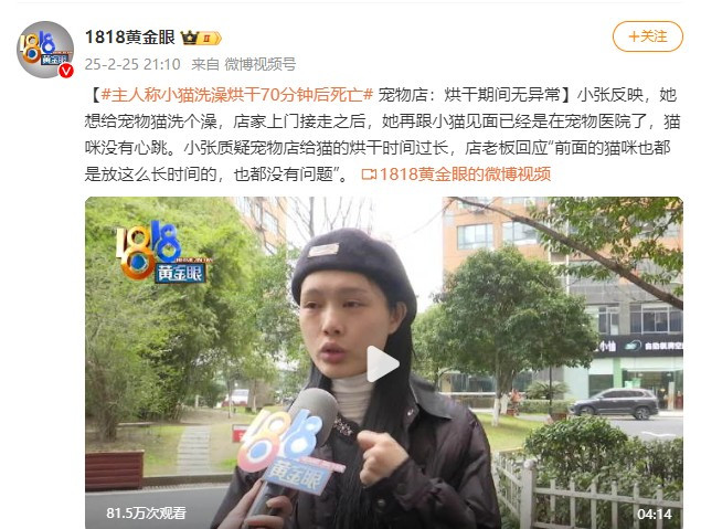 2月18号,张紫丹想要给自家猫咪贝贝洗澡,便在网上找了一家宠物店,订了一个洗猫服务,谁承想,对方上门将猫接走后,再见面却是阴阳两隔。