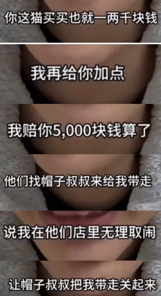 老板自知理亏,便告诉张紫丹,买一只美短的价格也就一两千块,便打算再加点儿,凑5000块赔给张紫丹,可六年的感情,哪里是5000块可以买断的,张紫丹当即拒绝,和老板闹了起来。