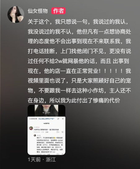 张紫丹看到“索要两万”的言论后,对此进行了回应,她称自己没有说过“不给两万就网暴”的话,而且出事后,他的店铺一直在营业,没有关门。