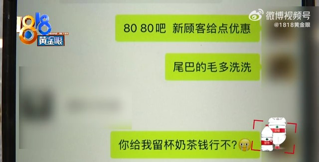 因为她是新顾客,张紫丹便提前和老板在手机上进行了沟通,确定了整个流程,当时,老板还告诉她,贝贝超重,需要再加50块,高地猫因为要去油,则加了80块,张紫丹可在洗完后付钱。